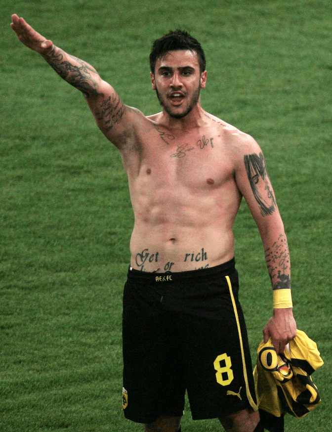 Ayer la prensa se llenaba la boca con el titular de que un jugador de fútbol había sido suspendido de por vida por hacer un saludo nazi. Pues mira, guapa, ni lo uno ni lo otro. Giorgos Katidis metió un gol y lo celebró levantando el brazo como lo hacían los nazis. Al llegar al vestuario tras terminar el partido vio la que se había liado en Twitter y se apresuró a pedir perdón diciendo que no era nazi y que había hecho ese gesto de forma espontánea. La parte de la suspensión viene por parte de la selección griega de fútbol, que en pocas horas ya tenía un comunicado diciendo que no jugaría nunca más en la selección, por nazi. Toma ya. Pero vamos, que el chico puede seguir jugando al fútbol en cualquier otro sitio.
