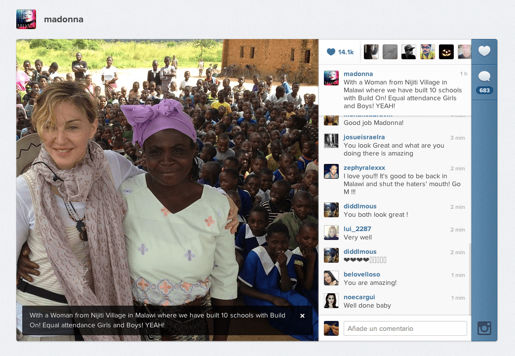 Ya nos lo estábamos barruntando ayer tras ver las fotos que subieron a Instagram Brahim y Rocco (Brahim sin filtro y Rocco con el filtrito ese que difumina todo menos lo que tú señalas, que en el caso de Rocco fue: él). Hoy ha sido Madonna la que ha subido una foto a su perfil presumiendo (y muy bien que hace) de las 10 escuelas que ha construido para niñas de Malawi. Ha estado acompañada en todo momento de David y Mercy James