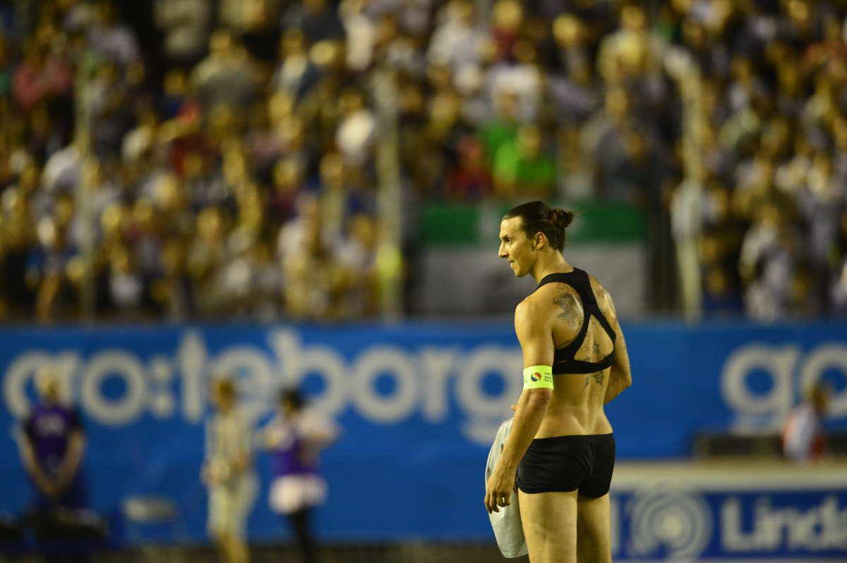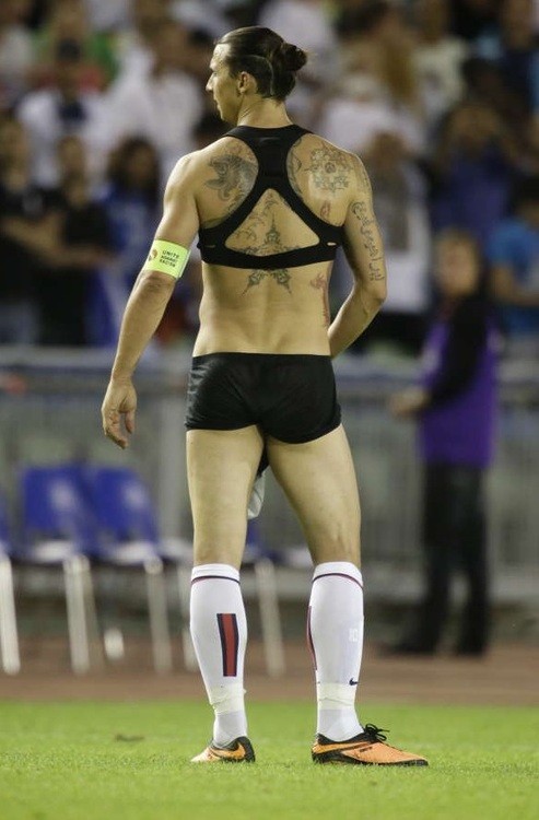 ¿Qué demonios hace Ibrahimovic, ex jugador del Fútbol Club Barcelona, con un bikini en medio de un partido de fútbol? Pues a ver, para empezar al parecer no es un bikini. Son unos calzoncillos y una camisetita corta de aspecto deportivo (y con “aspecto deportivo” nos referimos a que parece uno de esos sujetadores que usan las chicas para ir al gym).