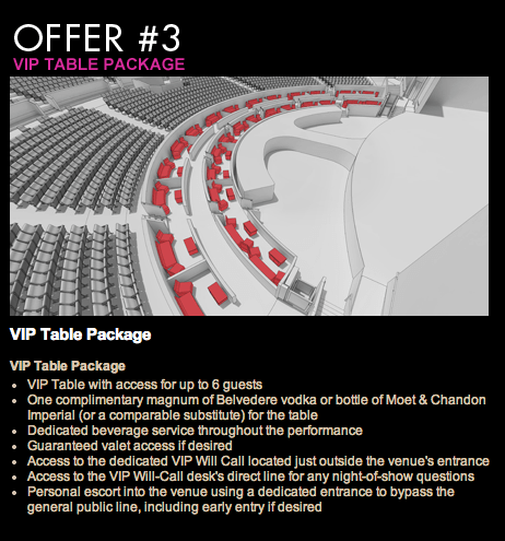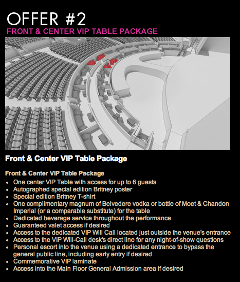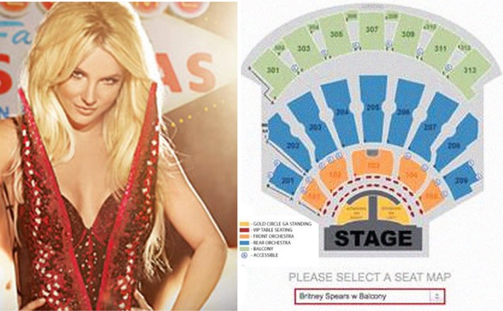 Ya se han filtrado los planos de situación de las entradas para ver a Britney Spears en los conciertos de Las Vegas que anunciará en breve. Lo más llamativo del tema (no son los 310.000 dólares que se llevará por cada uno de los shows) es ver que entre todas las entradas disponibles hay una opción que es ver a Britney desde una mesita VIP con tu cenita y tu copita de cava. Vamos, lo que le faltaba a un concierto de Britney…