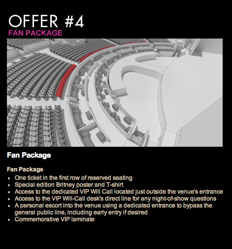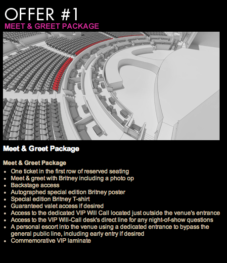 Pincha aquí para ver todos los tipos de entradas, que van desde el ‘Meet&Greet’ hasta la entrada+camiseta y lámina conmemorativa. También podrás acceder al backstage. Vamos, buffet libre de Britney para todos: