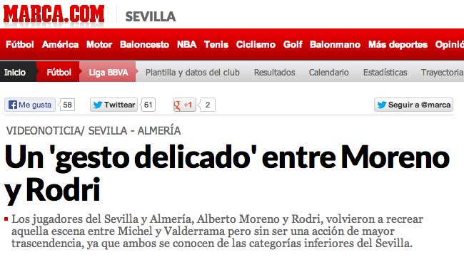 Vemos en Marca un vídeo de los jugadores Alberto Moreno del Sevilla y Rodri del Almería (anteriormente en el FC Barcelona) en el que están muy juntitos. Rodri parece acercarse hasta establecer contacto y Alberto Moreno no parece molesto por el mismo. A continuación Rodri baja su mano y ejecuta un movimiento que genera una reacción de Alberto. Éste le aparta la mano con gesto delicado.