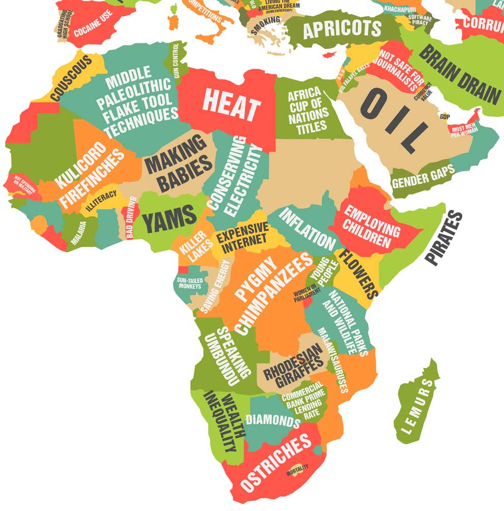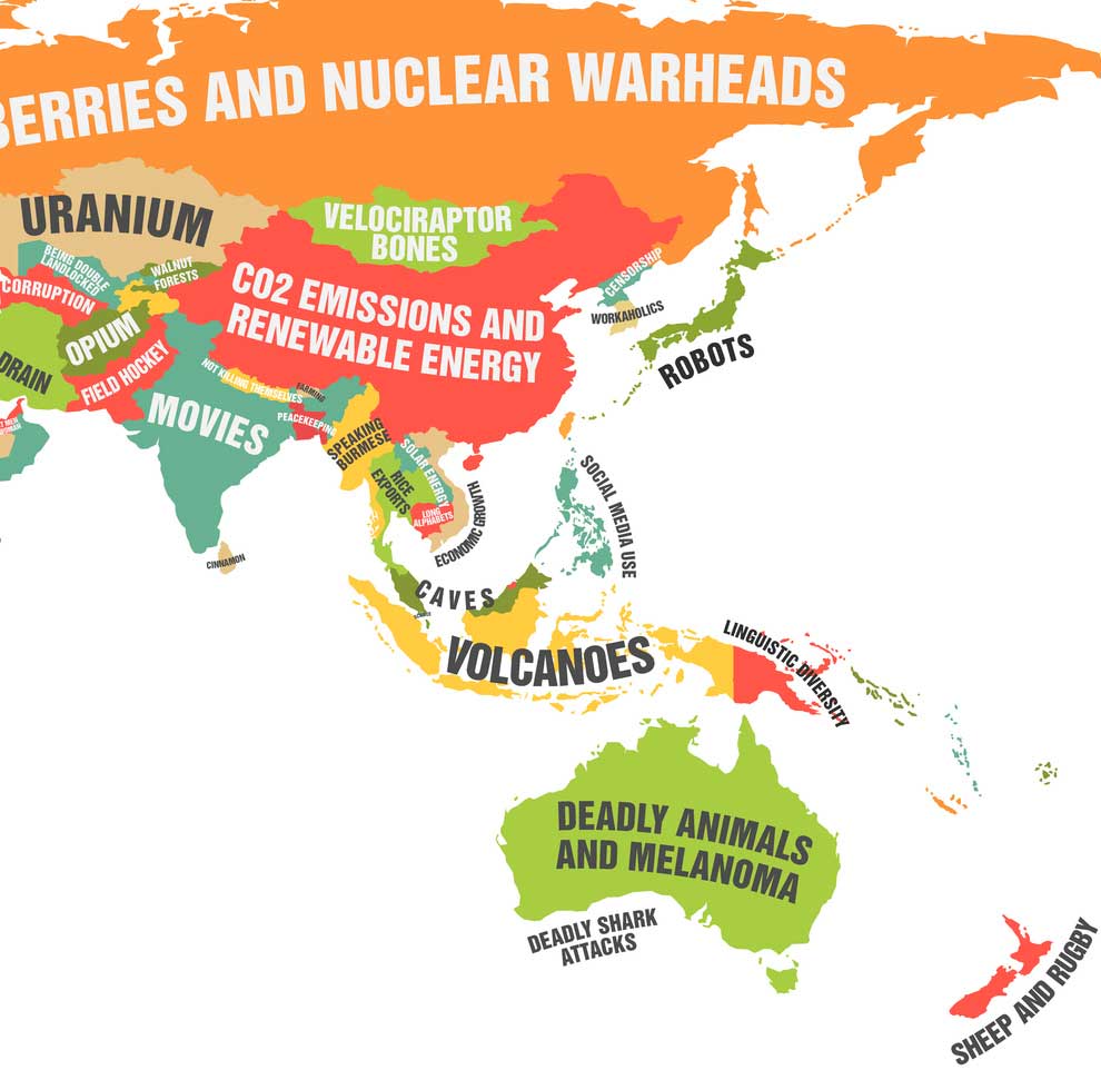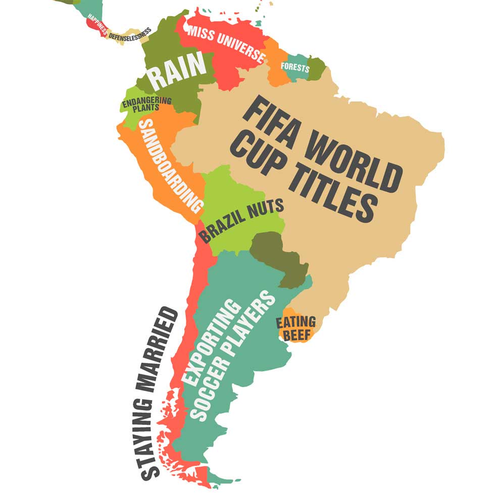 Un estudio de diseño ha elaborado un mapa mundial reseñando qué cosa es en la que cada país tiene un record mundial. Encuentras desde el record de Chile, que es el país en el que la gente permanece más tiempo casada o el de Australia, que es el país con más casos de melanomas. ¿Y España? Adivina, adivina… Podrían habernos puesto como líderes en donación de órganos, pero han escogido otra cosa: Pincha en las fotos para ver las áreas en tamaño completo: