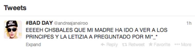 Bueno, sí que se sabe. La cuenta de @andreajaneiroo tuiteó antes de que todo esto saliera en los medios de comunicación un tuit en el que decía (este link va a la cahché de Google): “EEEEH CHSBALES QUE MI MADRE HA IDO A VER A LOS PRINCIPES Y LA LETIZIA A PREGUNTADO POR MI*_*.”