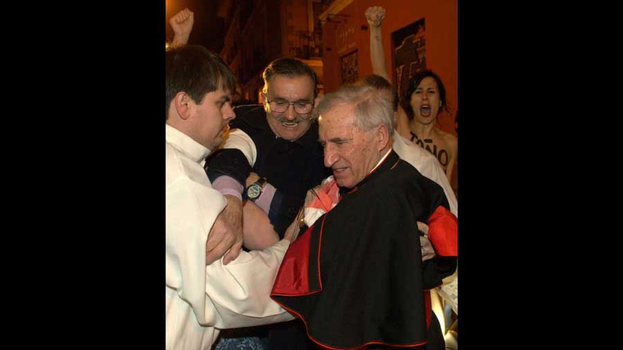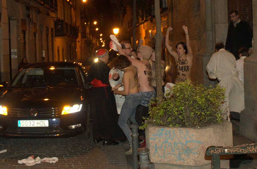 El colectivo FEMEN abordó ayer domingo al cardenal Rouco Varela. Ellas, con los pechos al aire, coreaban uno de sus lemas “aborto es sagrado” frente a unas estupefactas feligresas que se ponían manos a la obra para defender a su ídolo Rouco. Dos de las feligresas, tal y como se aprecia en el vídeo de abajo, comienzan a entonar cánticos religiosos mientras otra se encara con las activistas y les arrea unos cuantos empujones. Tampoco dejaron descubierto a Rouco sus secuaces, que como puedes ver en las fotos empujaron a las activistas con una clara rabia contenida.