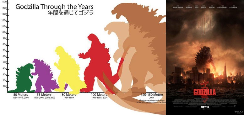 Según la comparativa que ya han hecho algunos (respecto al tamaño de los edificios que aparecen en el cartel), Godzilla habría pasado de los 55 metros de la versión anterior a los casi 150 metros de altura. Una diferencia bastante apreciable.