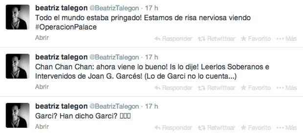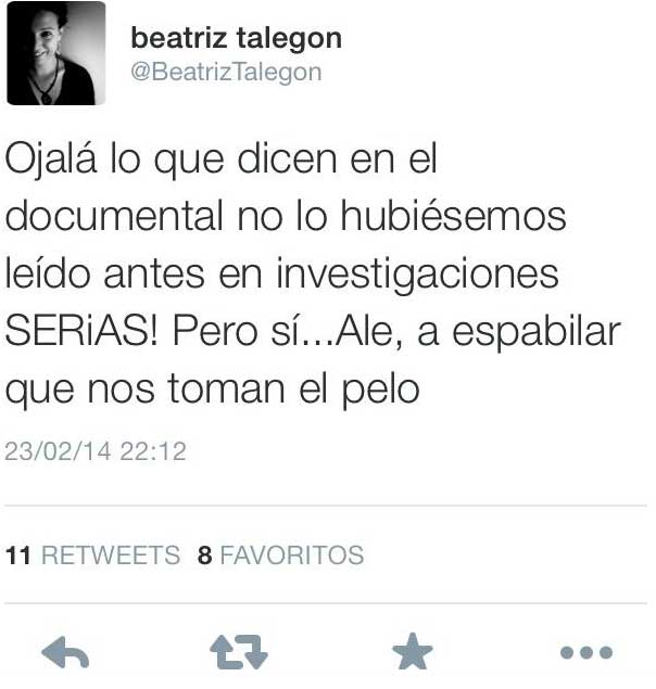 Hubo muchos espectadores que anoche creyeron que el documental de Jordi Évole era real, y no pasa nada. Pero hay gente que además de creérselo tuiteo en plan ‘Sopresa Sorpresa’ y el perro de la mermelada de Ricky Martin… Vamos, que dijeron que ellos ya lo sabían. Es el caso de Beatriz Talegón, que tuiteó tranquilamente que ella ya sabía todo lo que se contaba en el documental, que lo único que no sabía era lo de José Luis Garci…
