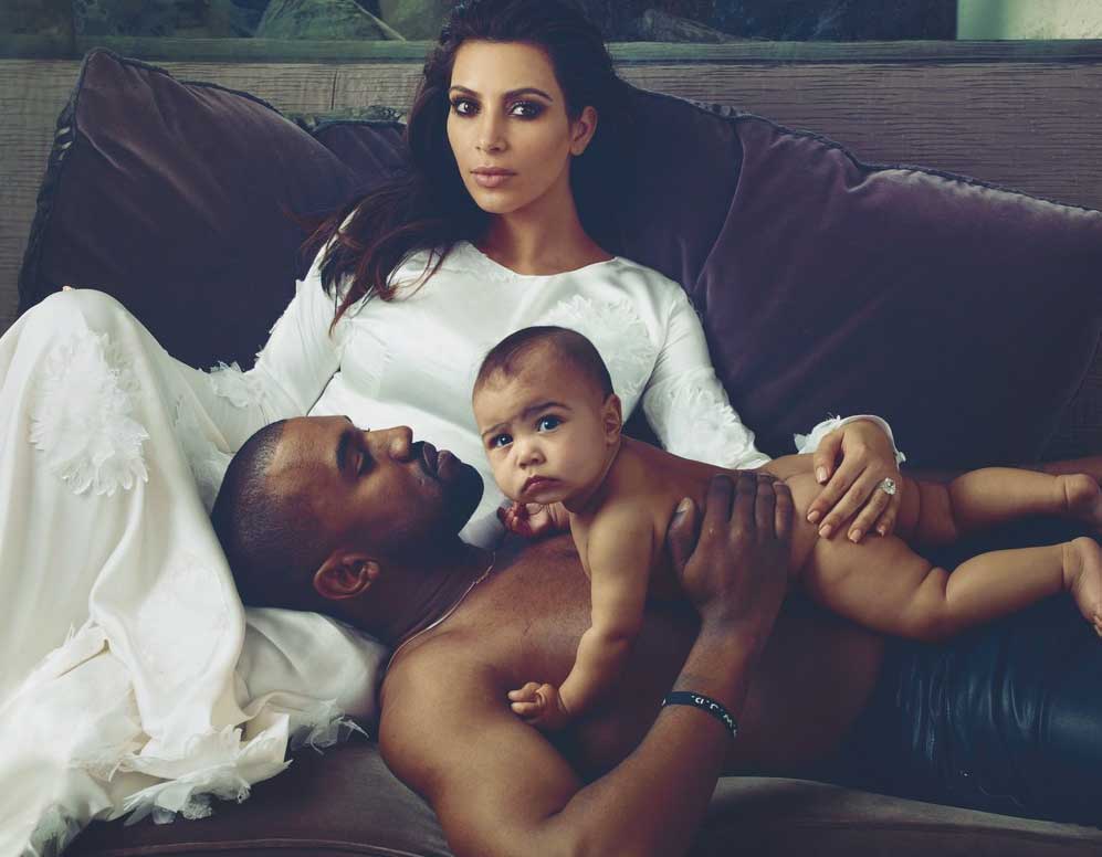 En las fotos se puede ver a Kim Kardashian vestida de novia y a Kanye West cogiendo en brazos a Nori West, que ya tendrá tiempo de quejarse a sus padres cuando sea mayor por sacarla como Dios la trajo al mundo en una revista que todo el mundo le recordará en el instituto.