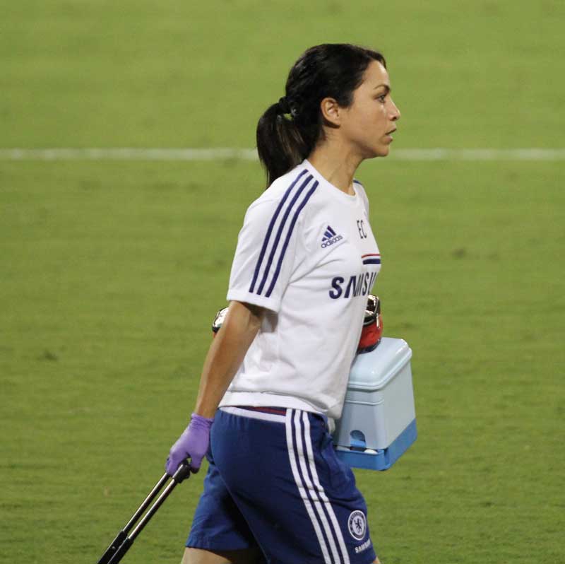 Es doctora del Chelsea, bailarina, madridista y nacio en Gibraltar. Tiene nacionalidad británica aunque habla español. Anoche se hizo aún más popular entre la audiencia española (en Reino Unido es muy popular) al atender la lesión de Cech. Al parecer mucha gente aún se sorprende de que una mujer pueda tener un cargo de ese tipo en un equipo de fútbol.
