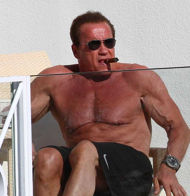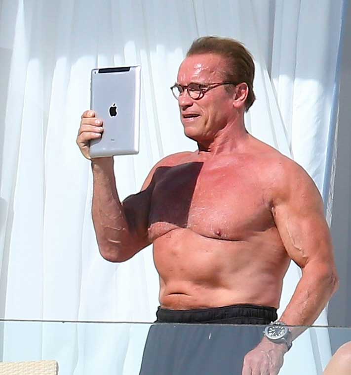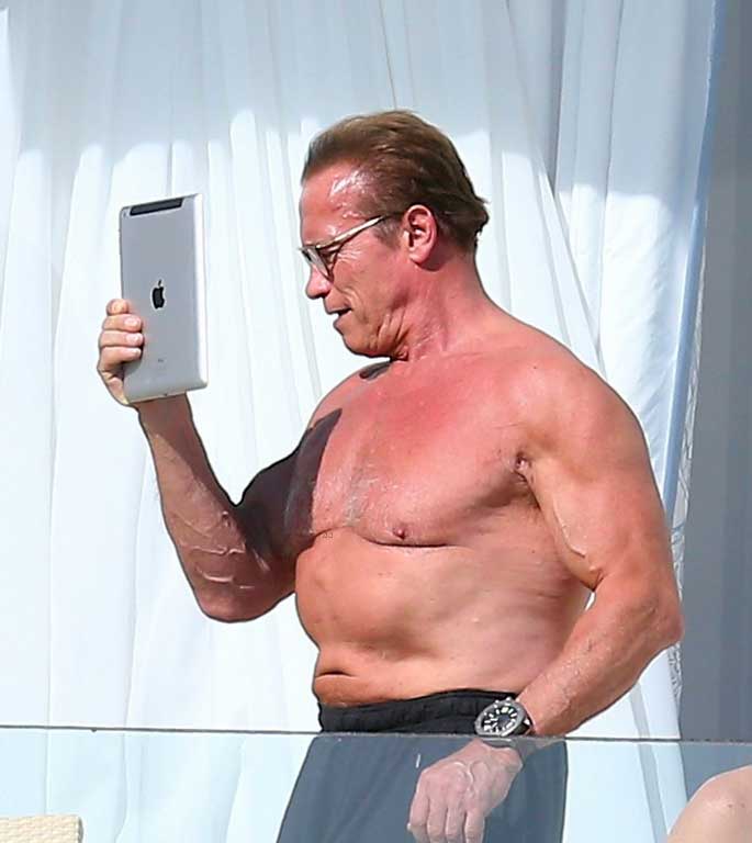 Arnold Schwarzenegger ha demostrado una vez más estar orgulloso de su cuerpo. A los 66 años el actor presume de pectorales y se pasea sin camiseta por el balcón de su hotel mientras se fuma un puro y juega con su iPad.