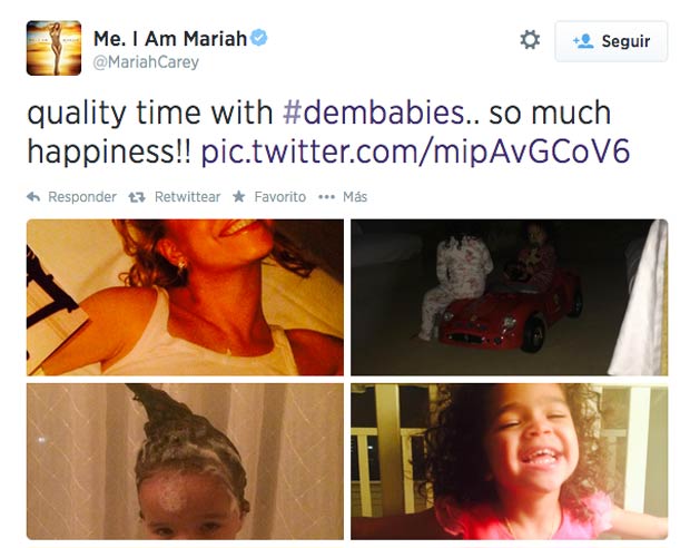 Ay, Mariah, que te han pillado. La cantante, que se encuentra de promoción con su nuevo disco, subió este fin de semana una serie de fotos con sus hijos acompañada de un mensaje en Twitter: “Pasando tiempo de calidad con los niños. ¡Qué felicidad!”