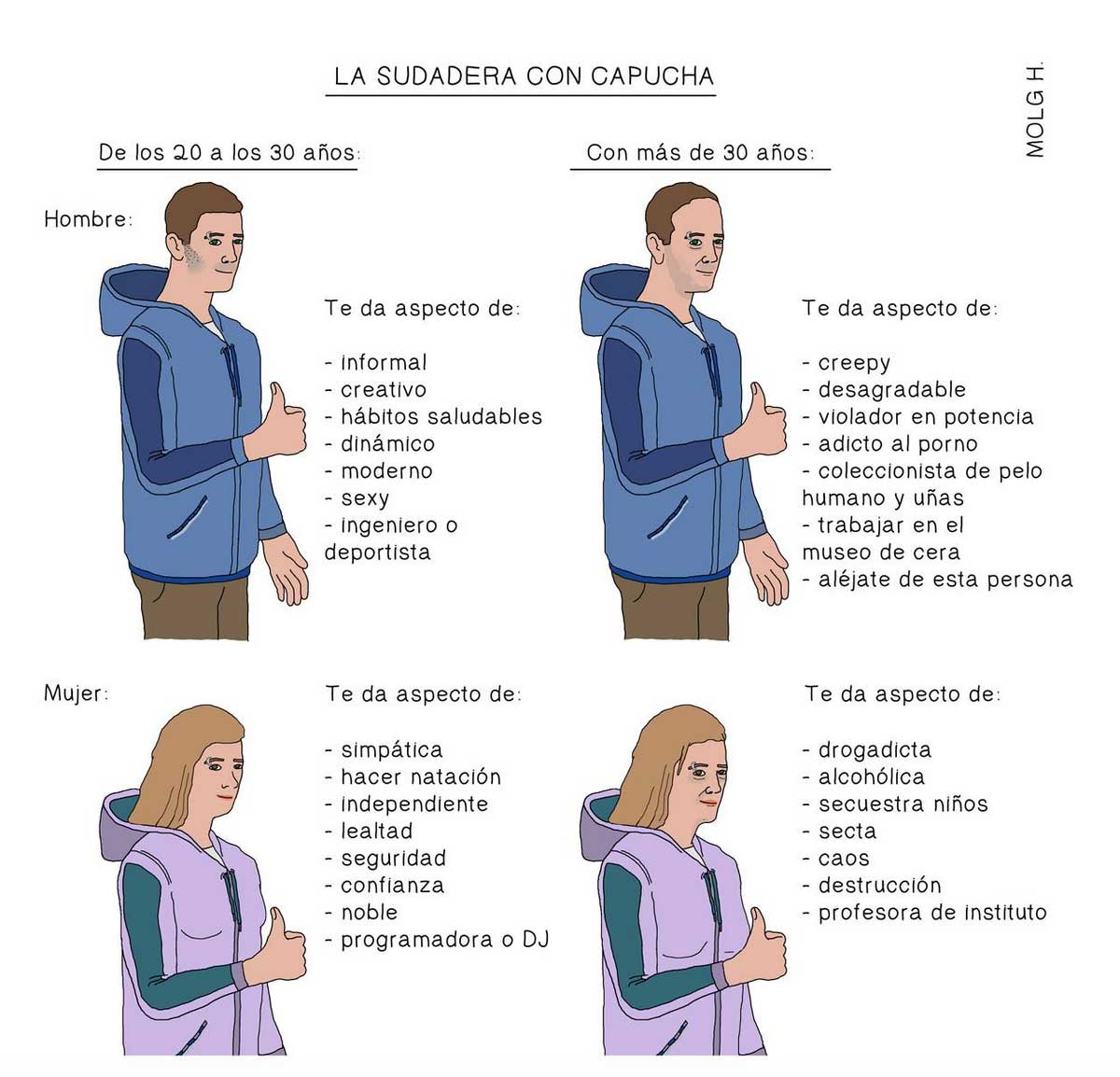 Este es el aspecto que según el genial ilustrador Molg H te da la sudadera antes y después de los 30 años: