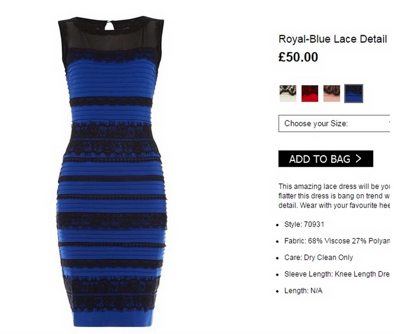La web buzzfeed.com ha realizado una encuesta, en la que han participado 1.817.800 personas, y cuyo resultado es que un 72% lo ven blanco y dorado. Sin embargo, la realidad es que el vestido original es azul y negro, como podemos ver en Roman, su tienda.