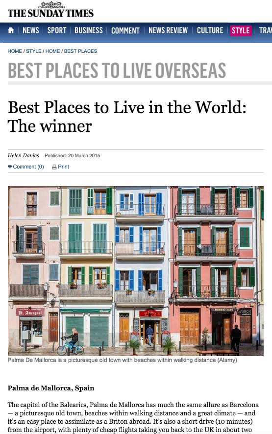 Según el diario inglés The Times, estas son las 50 mejores ciudades del mundo para vivir. El ranking no es por clasificación sino por orden alfabético. Sólo aparece Palma de Mallorca en el número 1 por ser la ganadora final.