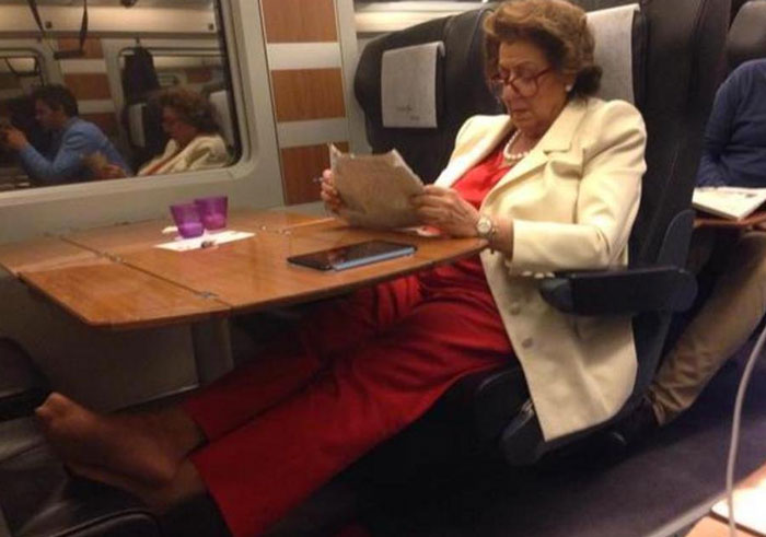 La Vanguardia ha publicado una fotografía en la que describen a Rita Barberá con los pies descalzos subidos al asiento de enfrente del AVE Madrid-Valencia en el que volvía a su ciudad tras una reunión en la sede central del Partido Popular.