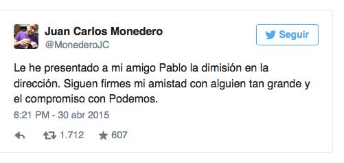 El encargado de anunciar la noticia ha sido Pablo Iglesias, quien con amargura ha informado de que la decisión se ha tomado esta tarde en una conversación “de unos minutos” entre ambos. En ella, el hasta ahora número tres ha dimitido de sus cargos en la ejecutiva, donde era el secretario de Programa y Proceso Constituyente. “Es enormemente doloroso”, ha confesado Iglesias, quien en todo caso ha dicho que no está de acuerdo con las reflexiones hechas por Monedero, donde reclamaba volver a los orígenes de la formación, más pegados al 15-M y la irreverencia política, en lugar de la nueva estrategia de moderación implantada por Íñigo Errejón y Carolina Bescansa.