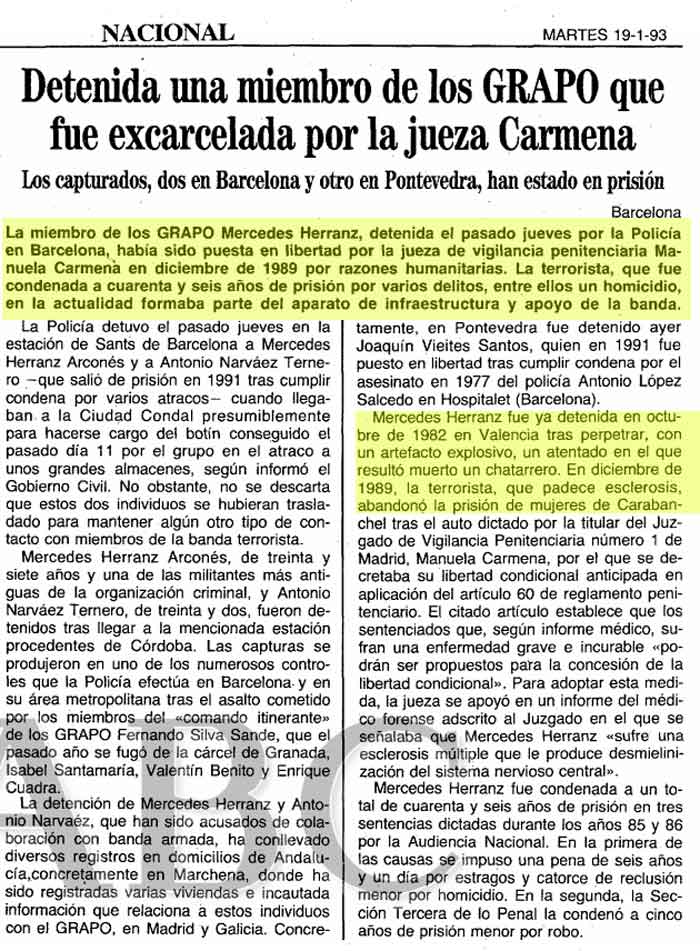 Esperanza Aguirre acusó anoche a Manuela Carmena de haber liberado a un etarra y a una terrorista de los GRAPO. Atónitos como estábamos frente a tales acusaciones nos dispusimos a bucear en la hemeroteca para si eso era cierto y cuáles eran los motivos por los que la candidata de Ahora Madrid lo hizo. Fue para “defender los derechos humanos”