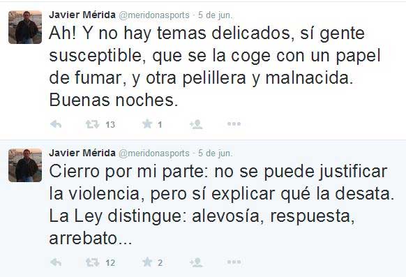Se llama Javier Mérida, se define como “periodista” y asegura, retador: “Hablo de lo que me apetece, sin restricciones”. El pasado 5 de junio intervino en una tertulia de Radio Marca y habló de la agresión del futbolista Van Der Vart a su exmujer, Sylvie, hace años en una fiesta de Nochevieja.