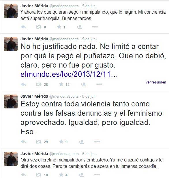 Según Javier Mérida “Ella le reconoció que le había sido infiel, a ver si vamos ahora a… Yo no sé qué paso, pero que si con dos copas en una fiesta de Fin de Año…Si tu le pegas una guantá eso no es ninguna agresión, ni es nada, ni maltrato, vamos a dejarnos de tonterías. La que está besando al otro, lo está haciendo muy bien, ¿no? Vamos a dejarnos de tonterías”.