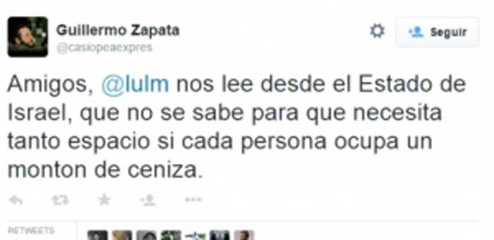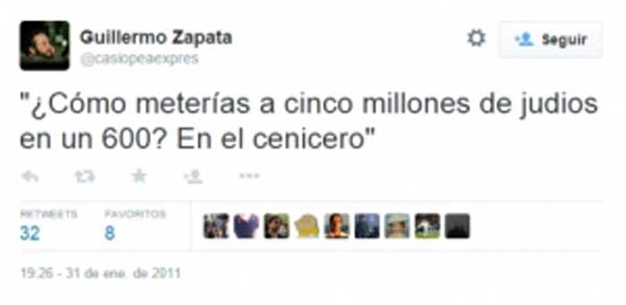 El diario El País ha recuperado algunos ‘tuits’ de Guillermo Zapata, concejal de Ahora Madrid en el Ayuntamiento de Madrid. Por ejemplo: “¿Cómo metes a cinco millones de judíos en un 600? En el cenicero”. Guillermo Zapata será concejal de cultura.