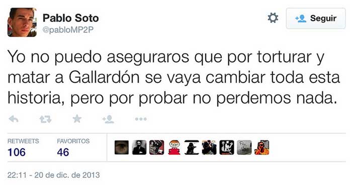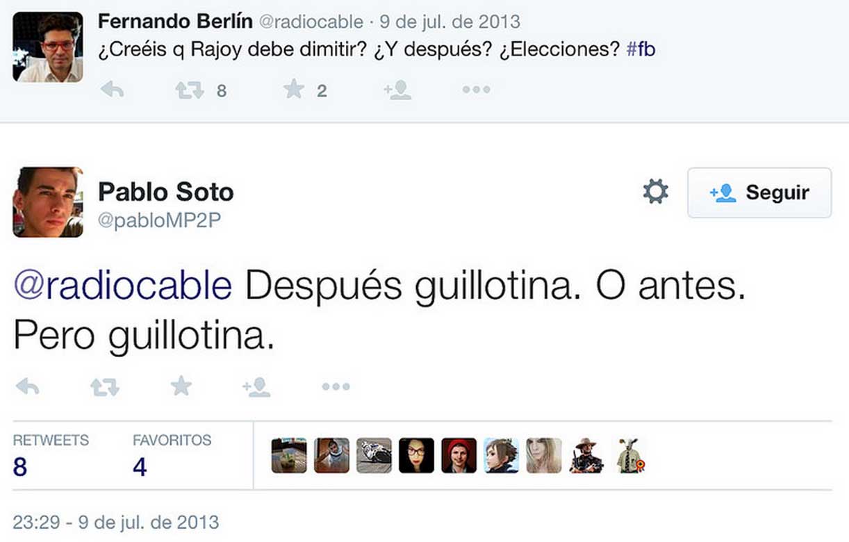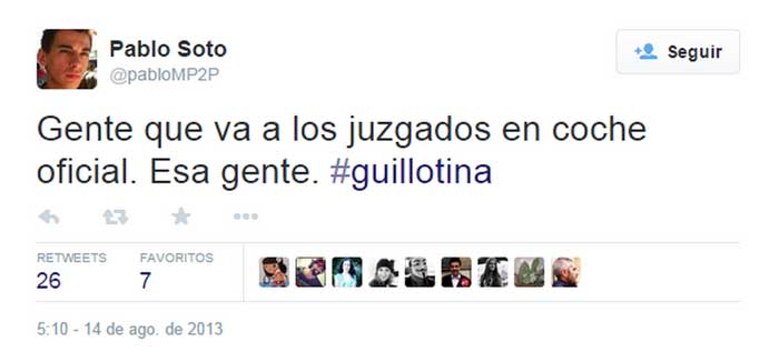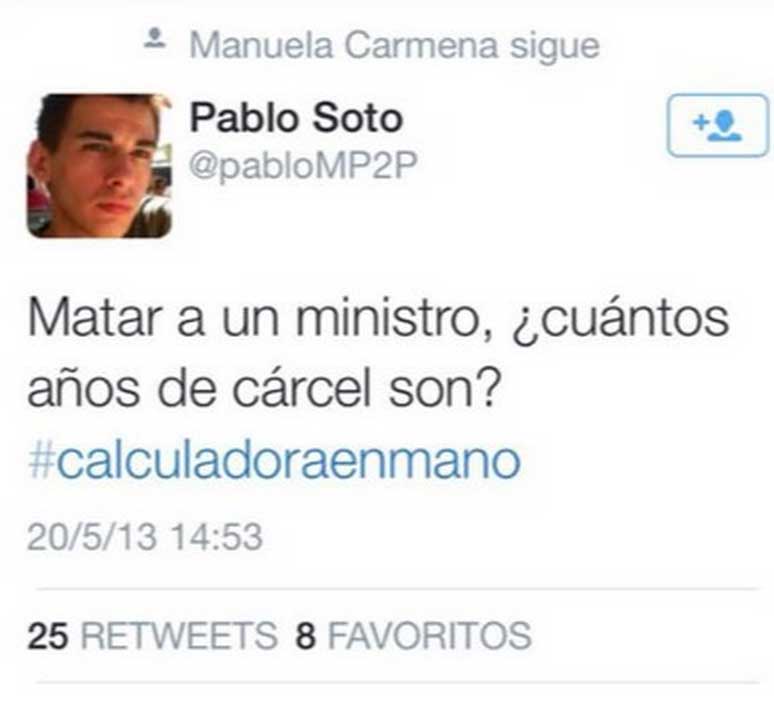 En numeros ‘tuits’ publicados en los últimos años hablaba de “torturar y matar” al ministro Alberto Ruiz-Gallardón “Y para mi próximo truco, necesitaré una guillotina, una plaza pública y a Gallardón” Seguidamente, desarrolló su idea con un nuevo mensaje en la red del pájaro azul. “Yo no puedo aseguraros que por matar y torturar a Gallardón se vaya a cambiar toda esta historia, pero por probar no perdermos nada”.