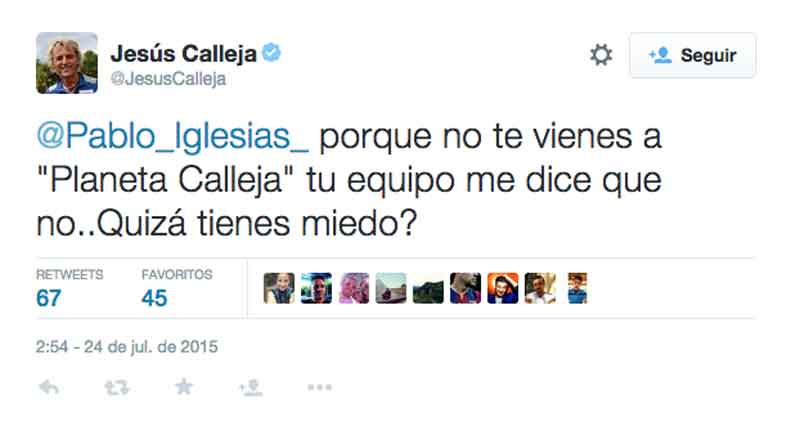 Jesús Calleja, presentador del programa de aventuras ‘Planeta Calleja’ ha usado Twitter para desafiar en público a Pablo Iglesias preguntándole si tiene miedo de ir a su programa.