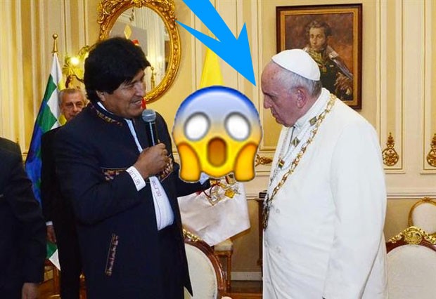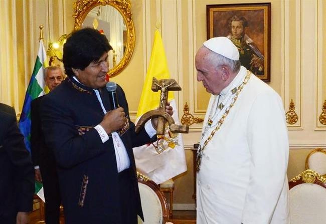 El presidente de Bolivia, Evo Morales, se ha convertido en el protagonista de la visita del Papa a Bolivia. El líder boliviano se inventó un nuevo símbolo: la hoz y el martillo comunista convertida en cruz para llevar a Jesús crucificado… La mezcla es tan impactante que ha ofendido tanto a comunistas como a religiosos. Vamos, que se ha lucido Evo Morales y ha dado pie a la creación de memes a mansalva en las redes sociales.