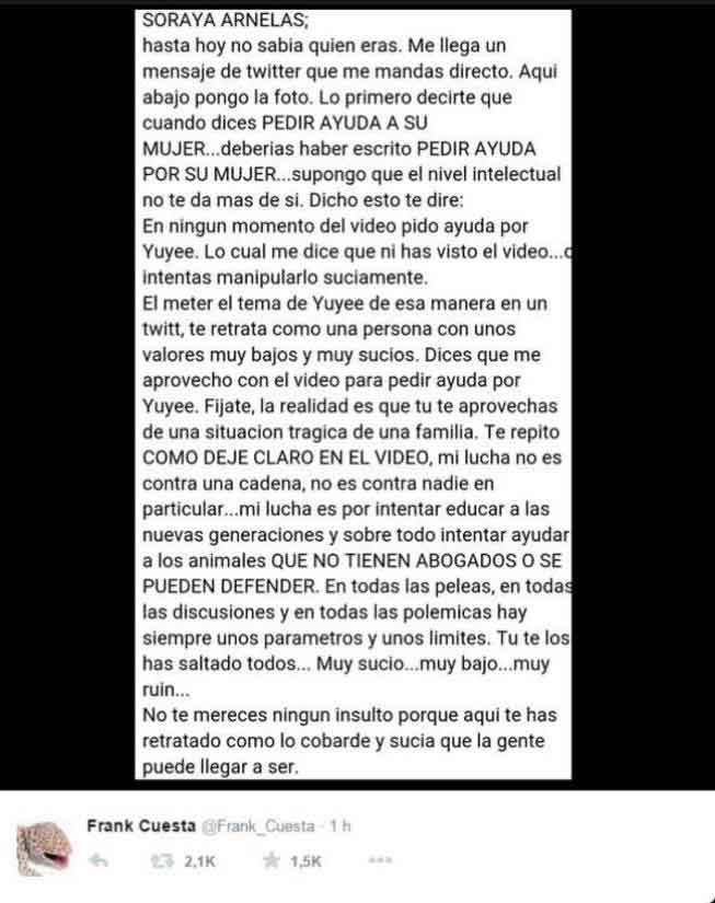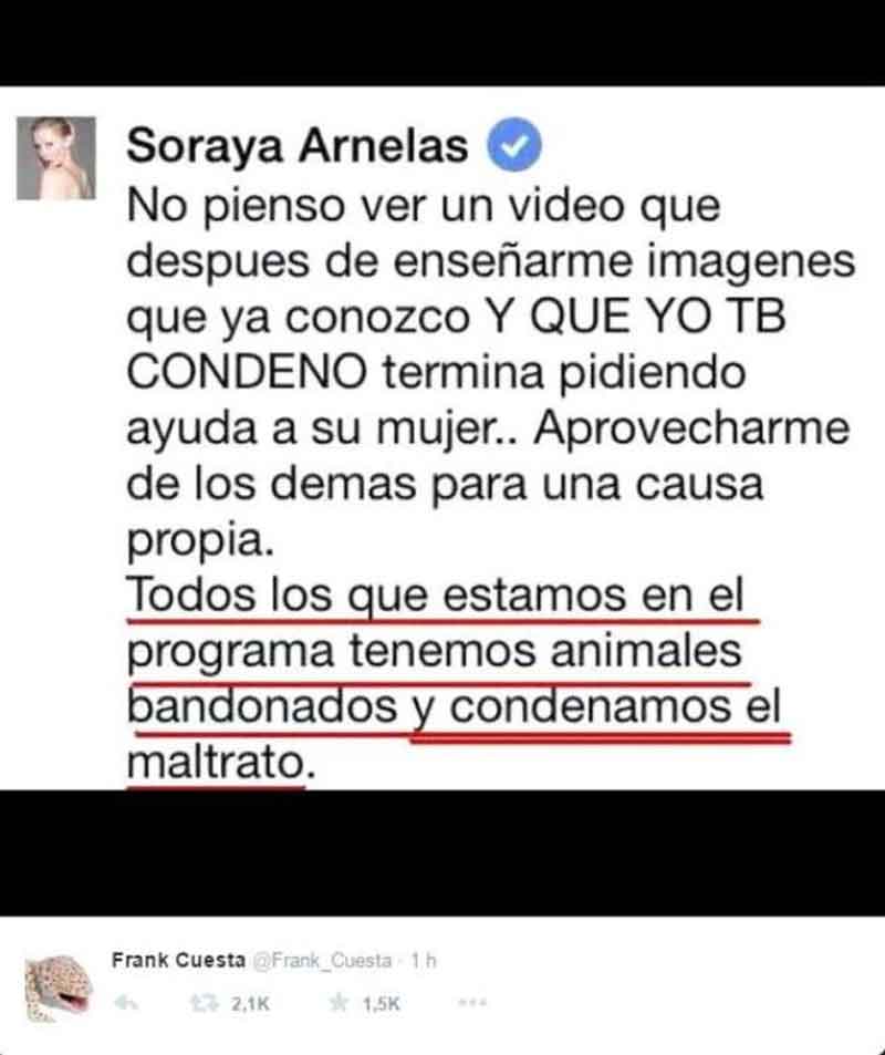 Soraya, al parecer, se muestra molesta porque ella dice que también condena el maltrato animal y que ha rescatado animales abandonados. Frank le dice que su nivel intelectual no da más de sí. Aquí los mensajes de esta nueva guerra.