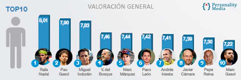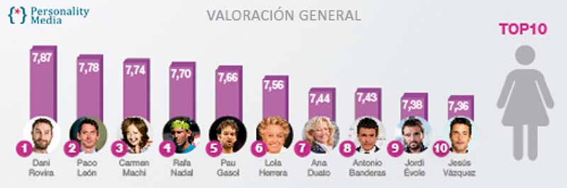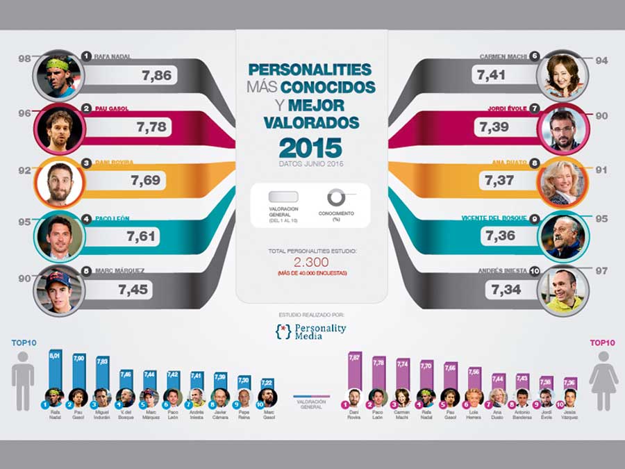 La compañía Personality Media ha hecho público su estudio anual para descubrir quienes son los famosos mejor valorados por los españoles. Aquí tienes el Top10 general y luego el Top 10 valorado por mujeres y hombres respectivamente.