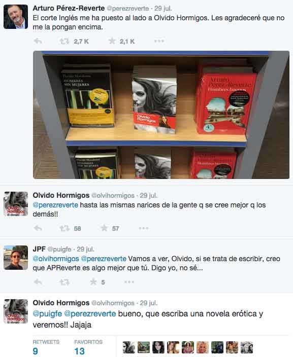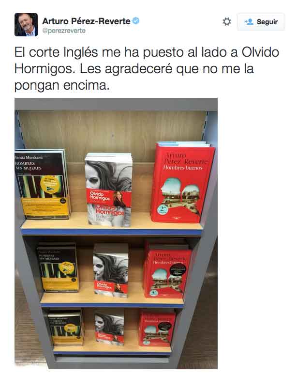El escritor Arturo Pérez-Reverte y la exconcejal socialista Olvido Hormigos se han enzarzado en Twitter y lo que más sorprende es que todo lo ha empezado el escritor murciano. Perez Reverte subía una foto de su nuevo libro junto al de Olvido Hormigos en El Corte Inglés y ponía: “‘El Corte Inglés’ me ha puesto al lado a Olvido Hormigos. Les agradeceré que no me la pongan encima”