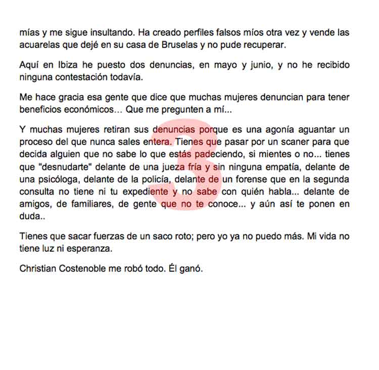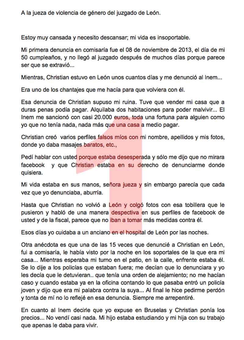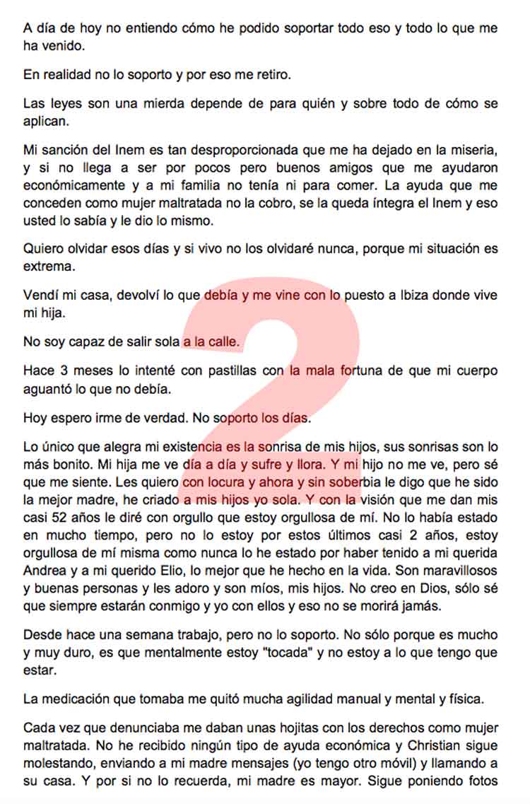 El diario El Mundo ha publicado la impactante carta que una mujer maltratada envió a la jueza que llevaba su caso antes de suicidarse por desesperación. Había puesto 19 denuncias, el agresor tenía 2 órdenes de alejamiento y una pena de 9 meses de cárcel, pero nada sirvió.