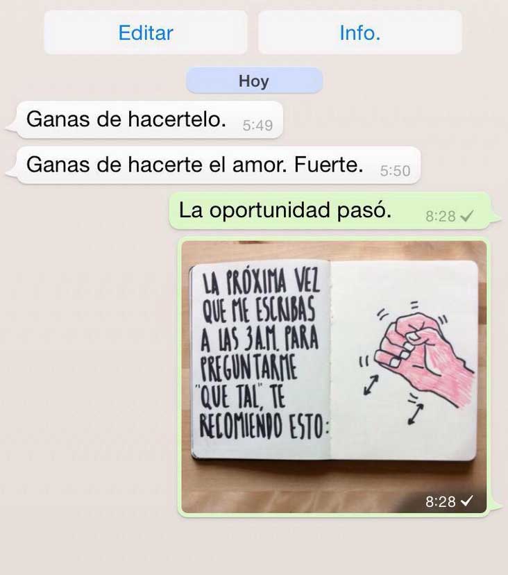 El chico le dice a las 5 de la mañana, así de repente, que quiere ‘hacérselo fuerte’ y ella le manda esta foto de ‘Fast Love’. Genial: