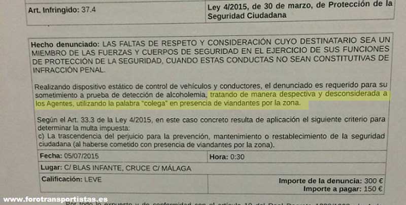 Un vecino de Málaga recibía este mes de julio una multa por utilizar la palabra “colega” para dirigirse a los agentes de seguridad en “presencia de viandantes por la zona”. Según cuenta el portal que se ha hecho eco de la denuncia, Forotransportistas, los hechos ocurrían el pasado 5 de julio durante un control nocturno de alcoholemia que realizaba la Guardia Civil. El ciudadano sancionado era requerido para someterse a la prueba de alcoholemia en la Calle Blas Infante (Málaga), cuando pronunció la palabra “colega”