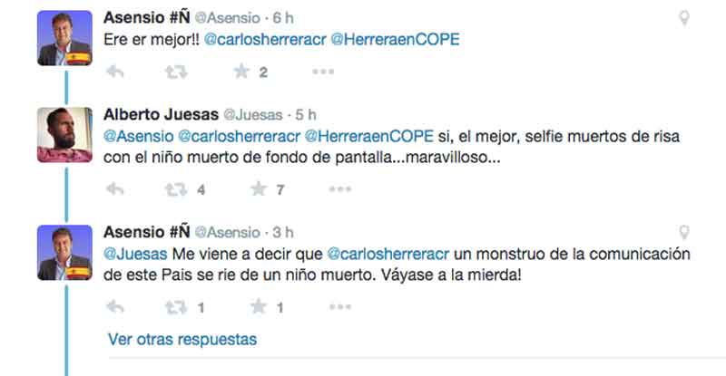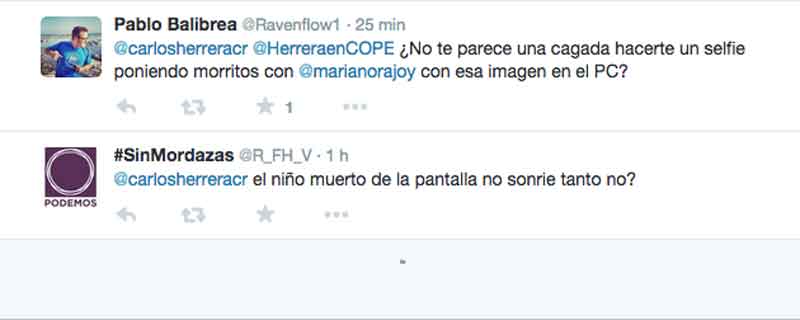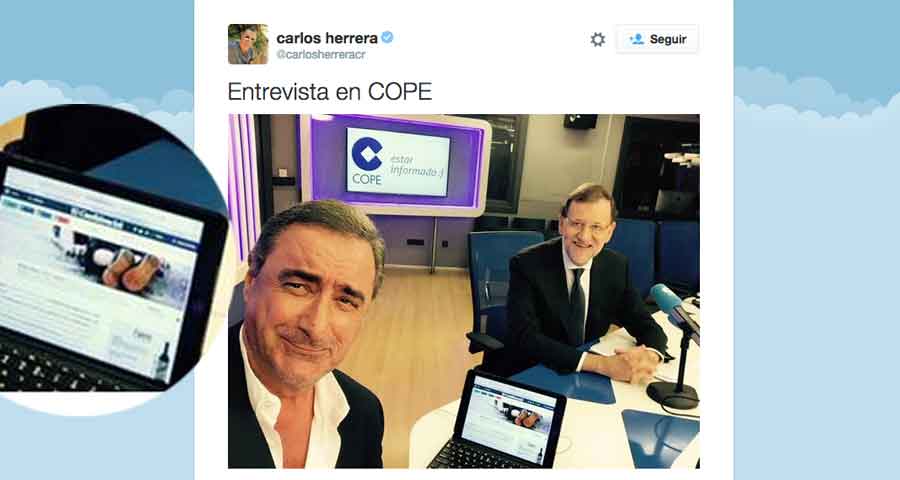 Carlos Herrera ha subido una foto hace unas horas a su cuenta oficial en Twitter en la que aparece con Mariano Rajoy. De fondo aparece su ordenador portátil en el que está viendo una web en la que aparece la polémica foto del niño que falleció esta semana en las costas de Turquía.