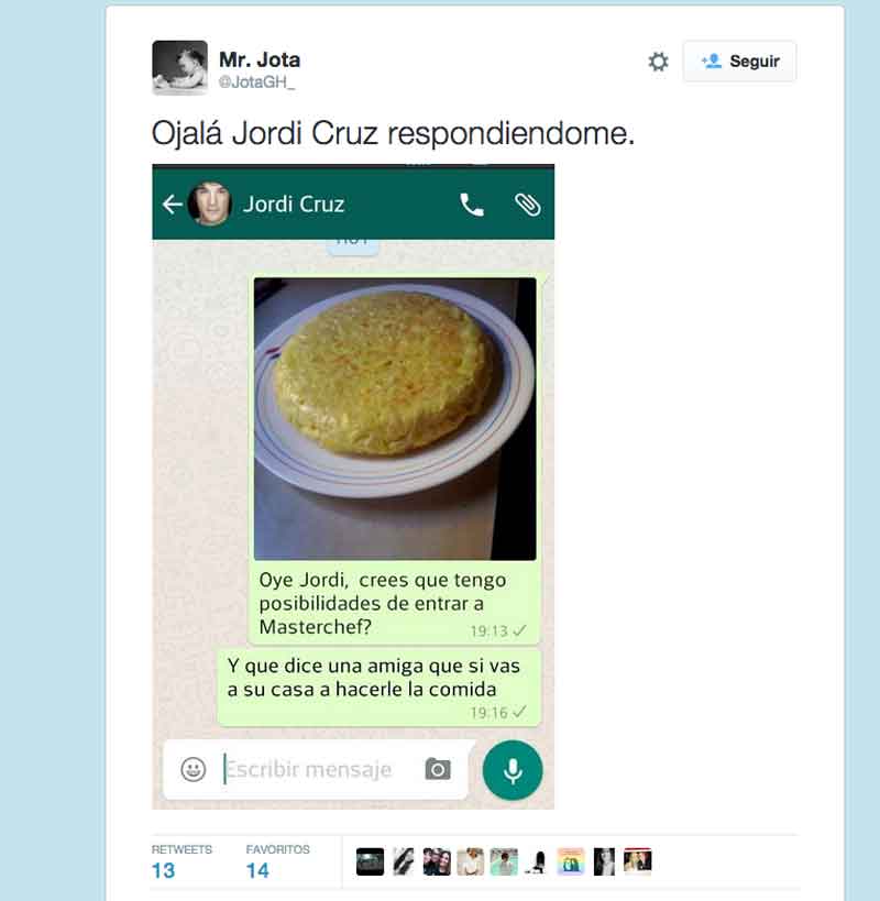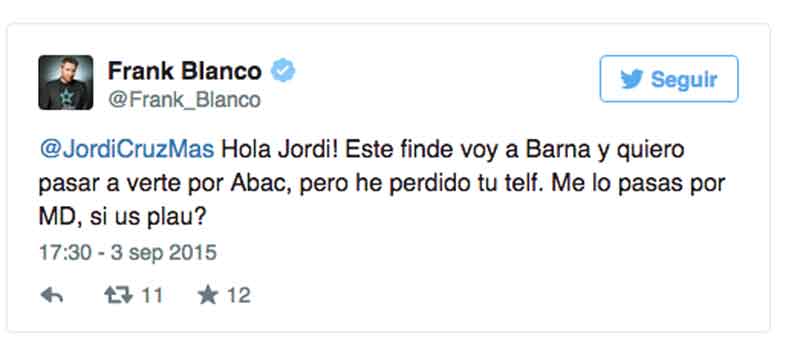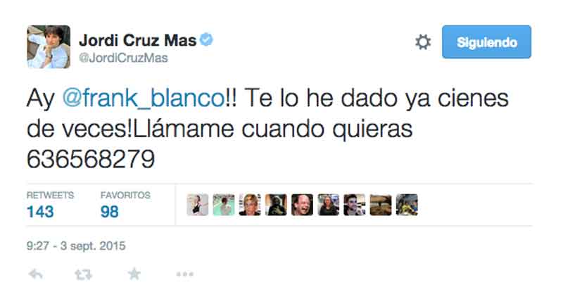 El cocinero Jordi Cruz ha publicado, presuntamente, su número de teléfono en su perfil de Twitter. Al parecer, Frank Blanco le ha pedido su número de teléfono para visitarle en su restaurante y Jordi Cruz le ha contestado con el número.