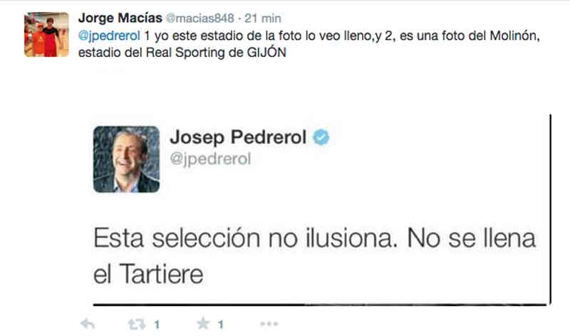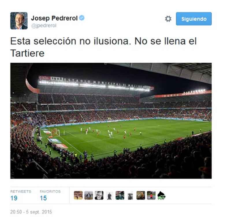 Pedrerol ha querido crear polémica entorno a la Selección Española y ha metido un poquito la pata. Ha subido una foto de un estadio que no se corresponde con el que él critica… y sus seguidores le han replicado ipsofacto.