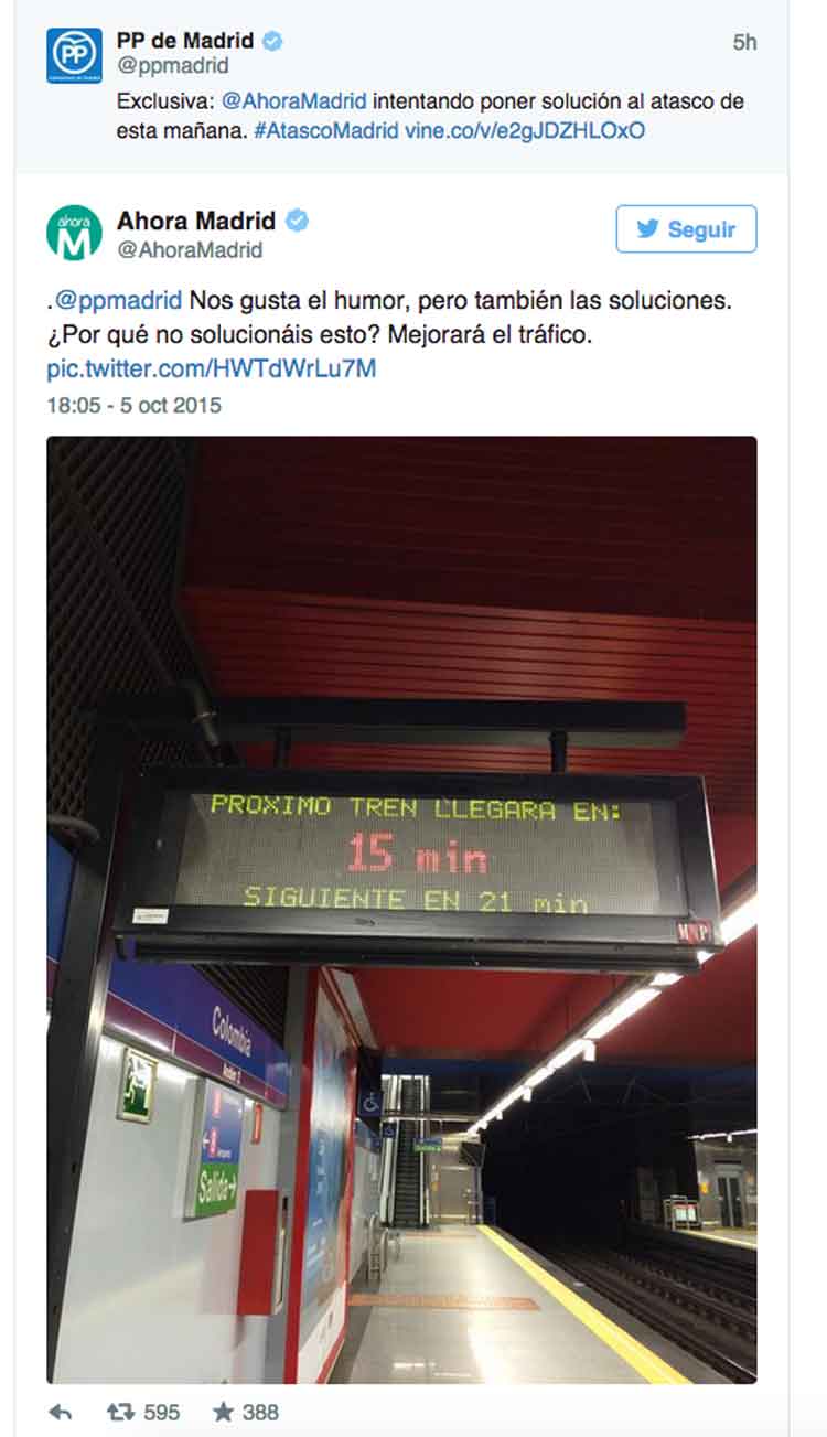 Con motivo del monumental atasco de esta mañana en Madrid por falta de agentes de movilidad el PP de Aguirre ha lanzado un ‘zasca’ a Manuela Carmena al que ha dado respuesta con otro ‘zasca’ del mismo tamaño que el atasco.
