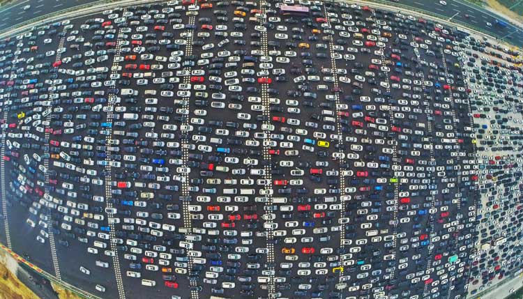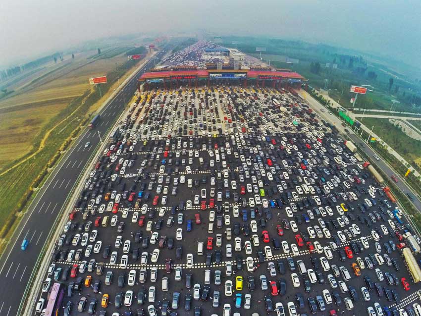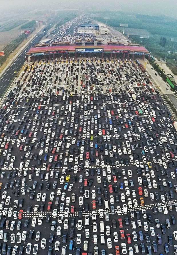 No es una fábrica de coches, es la entrada a la G4, la autopista que te saca de Pekín en dirección a ciudades como Hong Kong o Macao. Y es el pan de cada día de miles de personas que por trabajo tienen que ir de una ciudad a cualquier sitio que se encuentre en ese sentido (ya que de Pekín a Macao son más de 15 horas en coche)