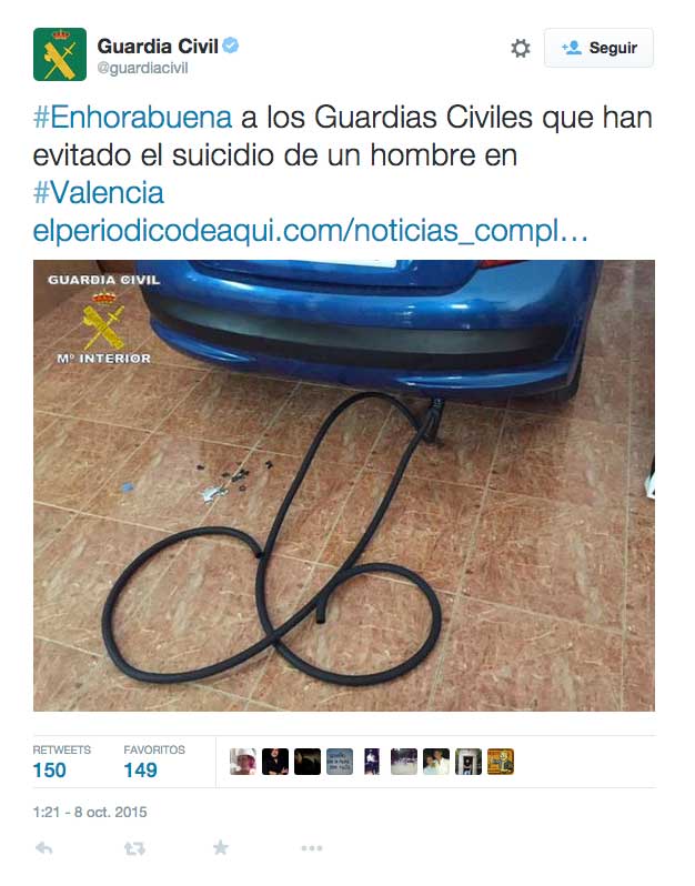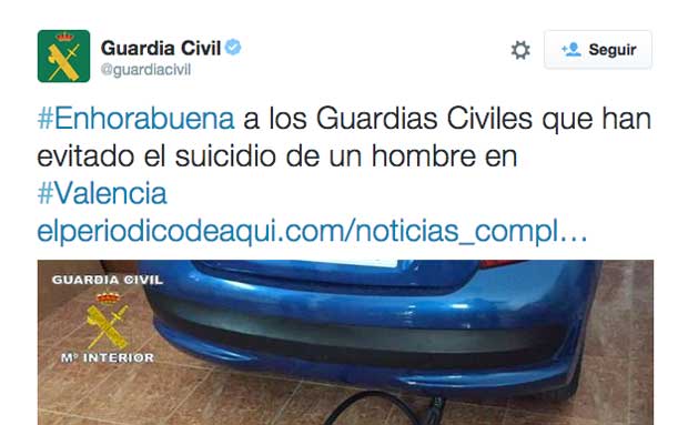La Guardia Civil ha subido esta mañana la foto de la escena de una tragedia que se ha evitado en el último momento. Han conseguido disuadir a un hombre que se intentaba suicidar.