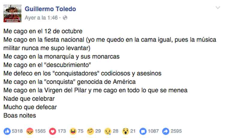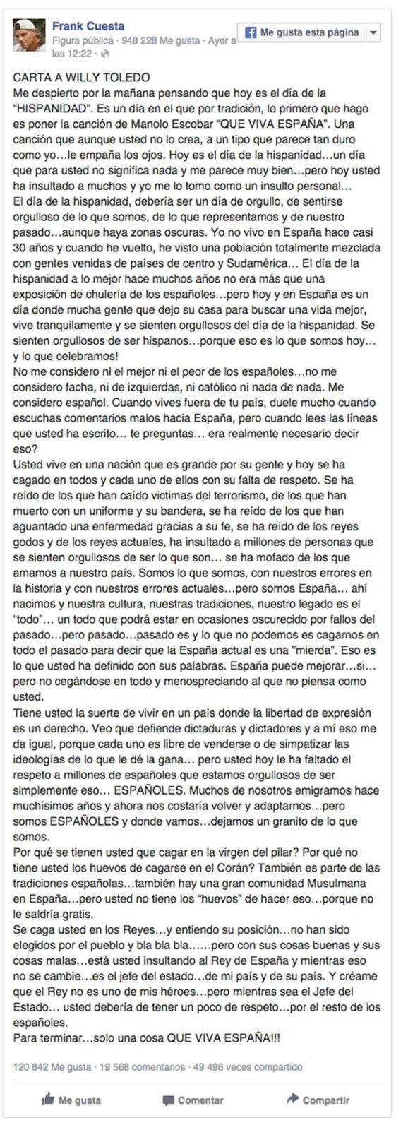 Dos amantes de la polémica han visto sus caminos cruzados por fin. Willy Toledo escribía el otro día un texto sobre el día 12 de octubre que no gustaba nada a Frank Cuesta. ¿Y qué hizo Frank? Pues escribirle una de sus famosas cartas al actor: