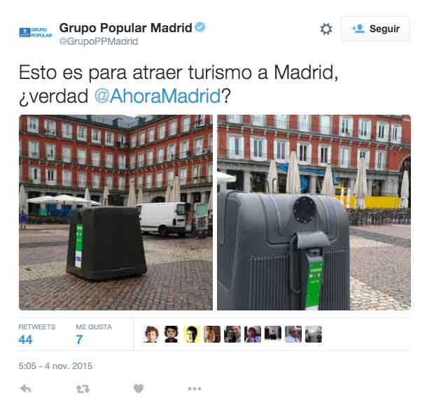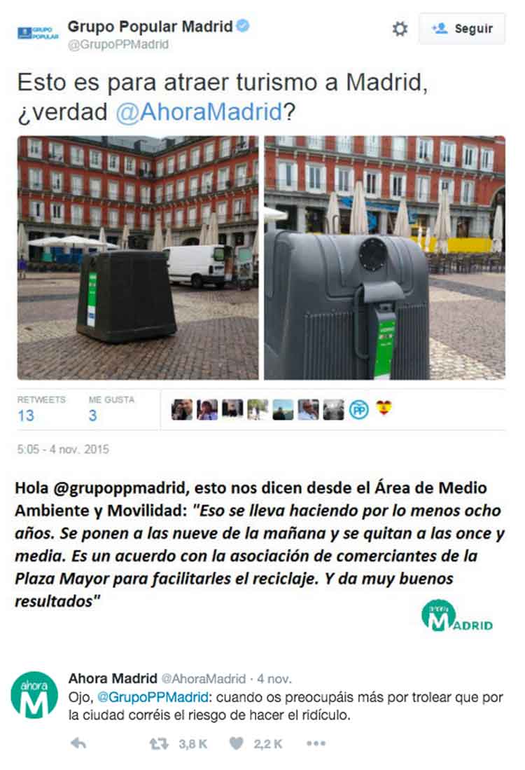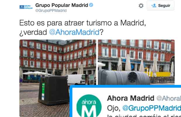 Atención a la contestación que le ha dado el equipo de Manuela Carmena al de Esperanza Aguirre cuando estos últimos han subido una foto de la Plaza Mayor de Madrid en la que aparece un contenedor de vidrio: