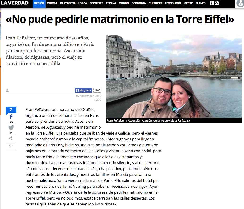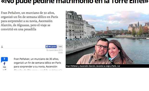 Una pareja murciana está siendo bastante criticada por su queja respecto a sus vacaciones aunque no se sabe si es un titular destacado por el medio que publica la noticia: “No pude pedirle matrimonio en la Torre Eiffel”.