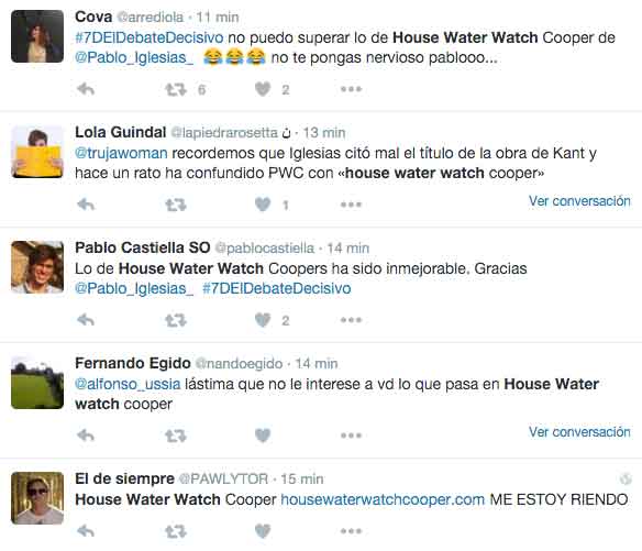 “Desde House Water Watch Coopers queremos darnos a conocer como una alternativa sólida, fiable y posible a todas esas empresas de consultoría con nombres impronunciables que solo confunden a las personas con coleta o dislexia” El nombre de la consultora original es Price Water House Cooper