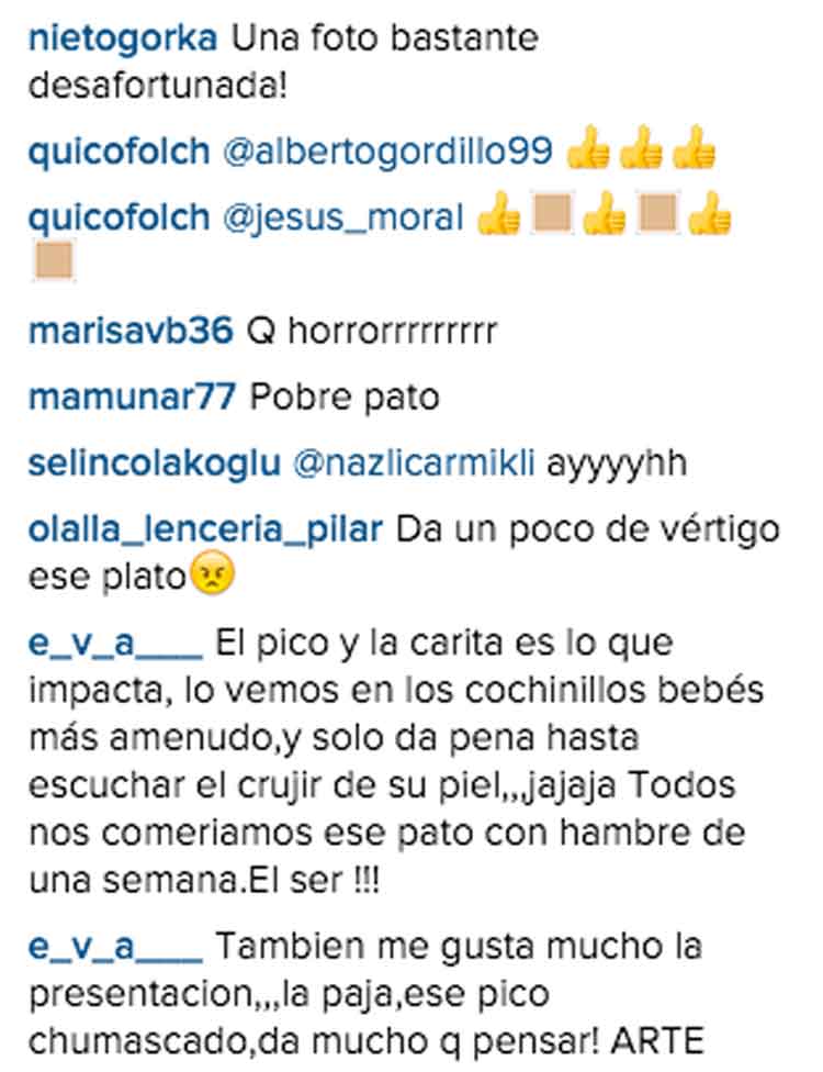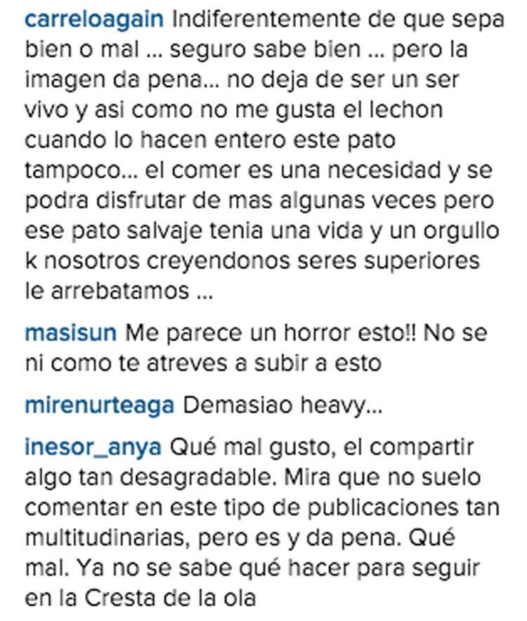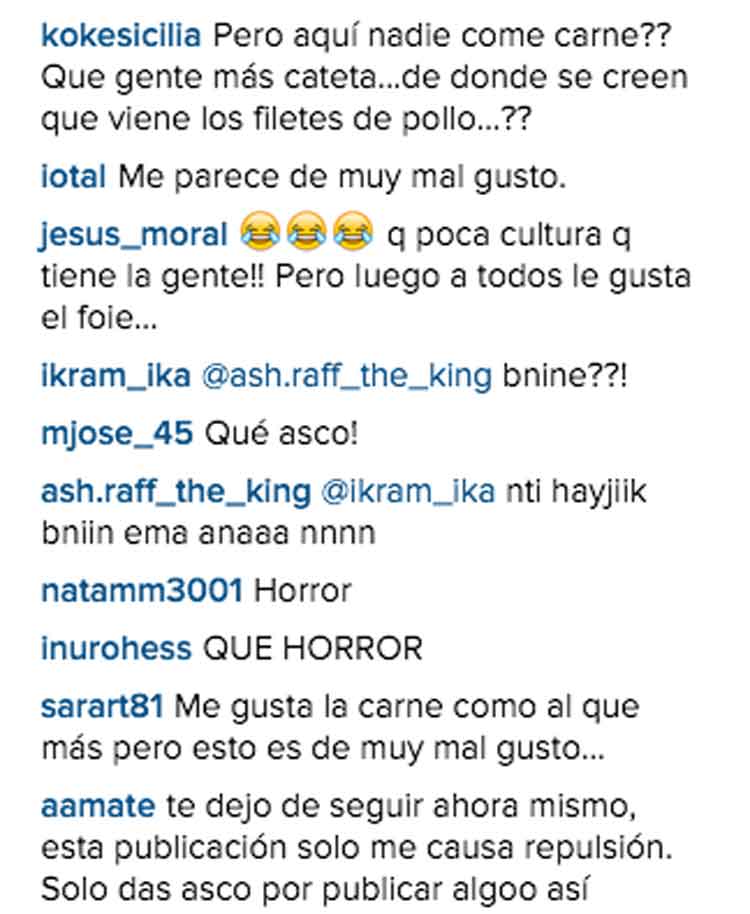 Comentarios como: “Horrible, unfollow”. ”¡¡Me parece un horror esto!! No sé ni cómo te atreves a subirlo”.”Estará bueno, pero da asquito”. “Qué mal gusto, el compartir algo tan desagradable”. “Eres un genio, pero no olvides que hay cosas que hieren la sensibilidad de las personas y esta es una de ellas”. “Y luego tu novia se queja del toro de la Vega”