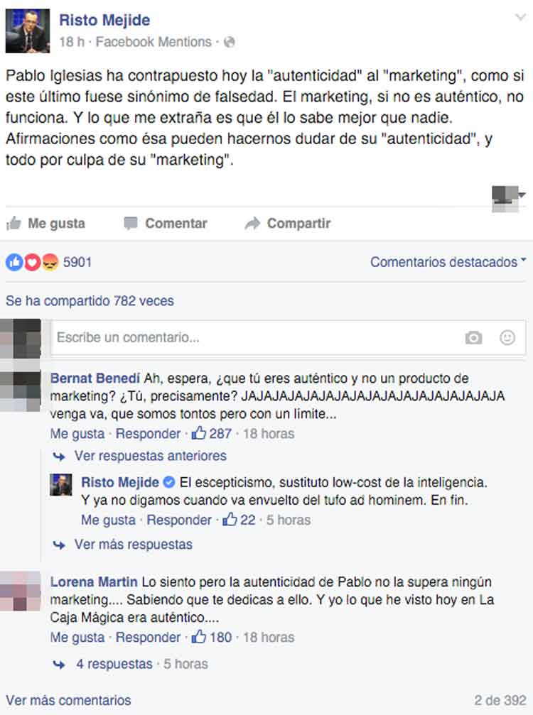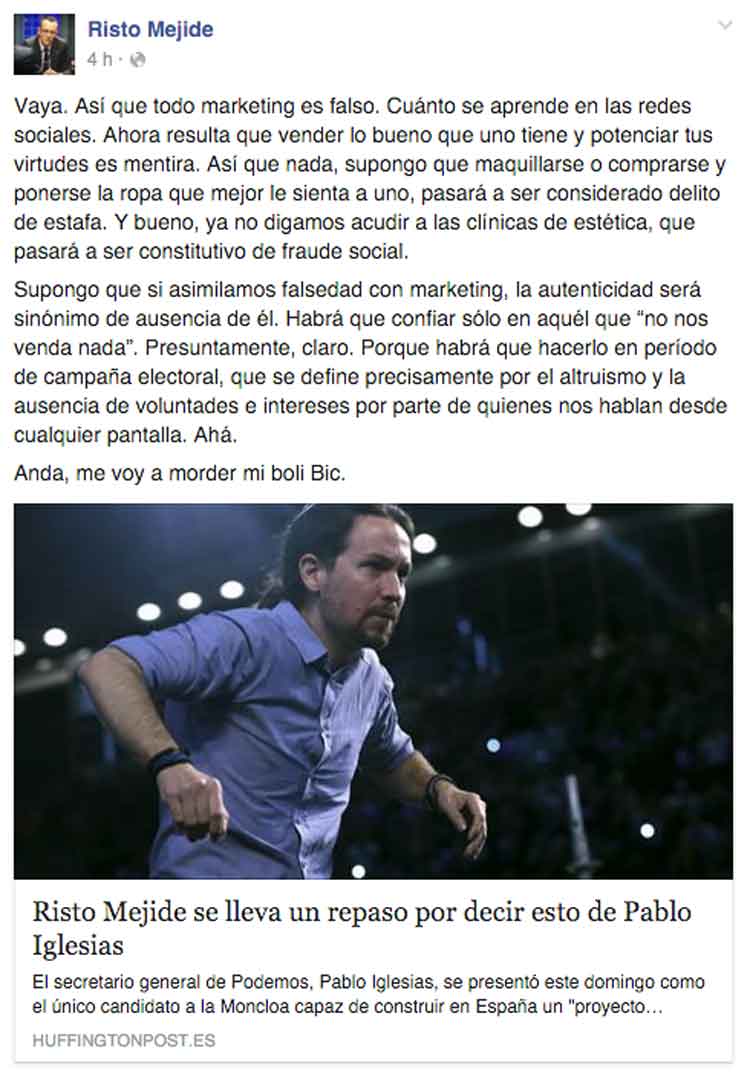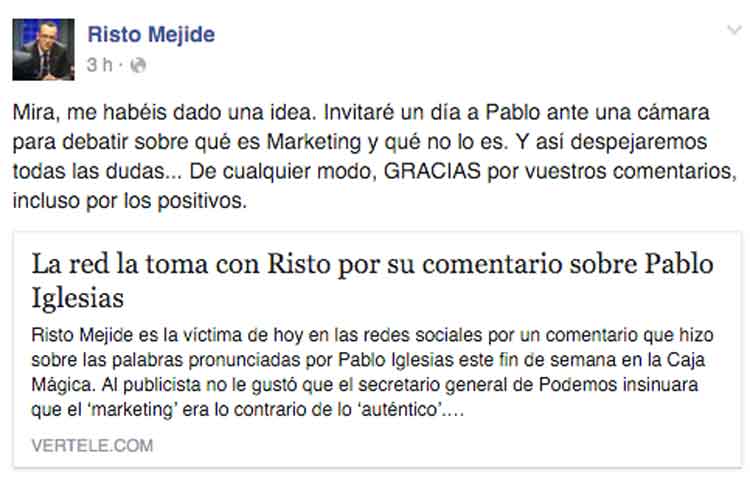 Risto Mejide comentó ayer en su cuenta de Facebook la opinión que Pablo Iglesias dio acerca del ‘Marketing’ en su mitin de la Caja Mágica y ha recibido una oleada de comentarios negativos por su apreciación. Aquí tienes lo que escribió inicialmente y lo que ha escrito después: