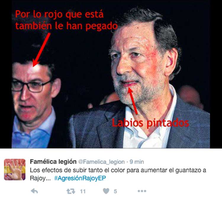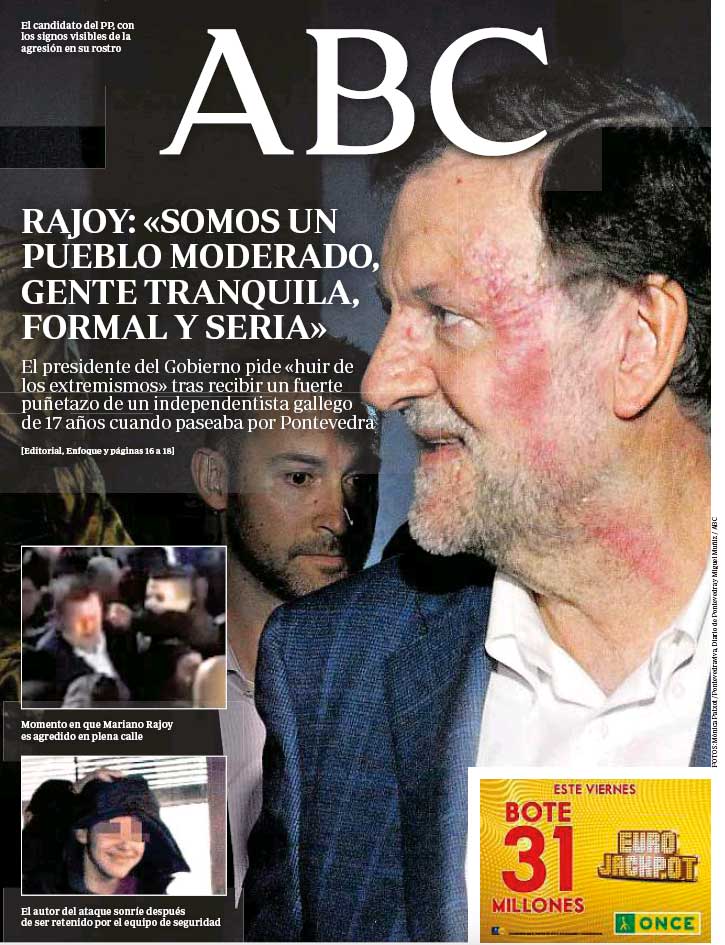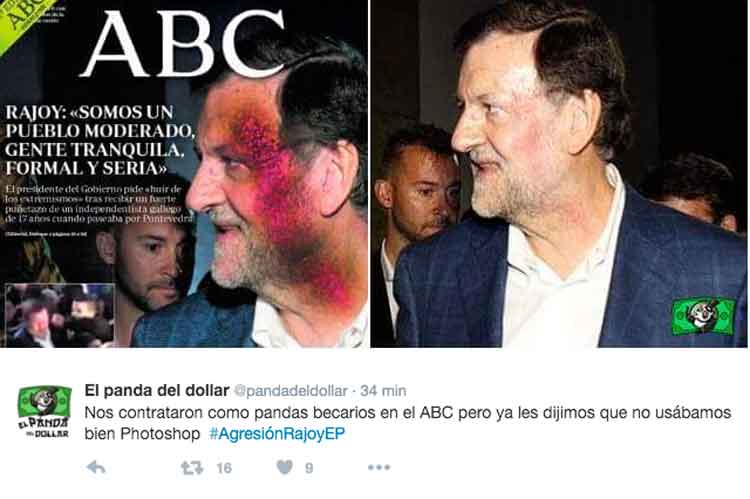El diario ABC ha sacado en portada la foto del puñetazo a Rajoy… pero la han retocado un poquito. El efecto del retoque es aún más dramático y las redes sociales se han llenado de memes.