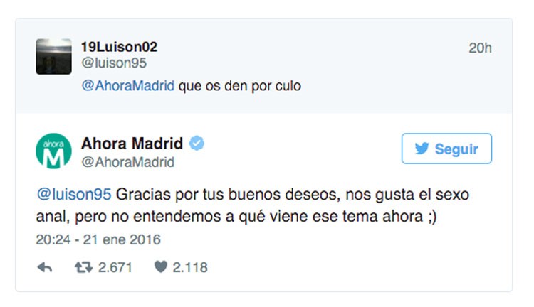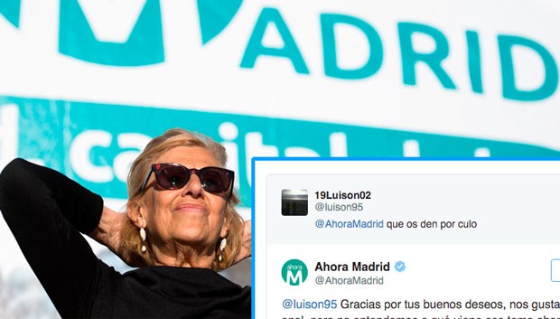 Un ‘tuit’ de Ahora Madrid ha creado revuelo en las redes sociales por lo cómico del asunto. Un usuario les decía directamente “Iros a tomar por culo” a lo que el partido de Manuela Carmena contestaba de forma directa.