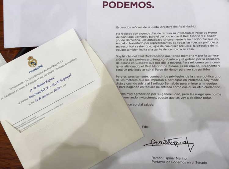 Un portavoz de Podemos envía esta carta al Real Madrid