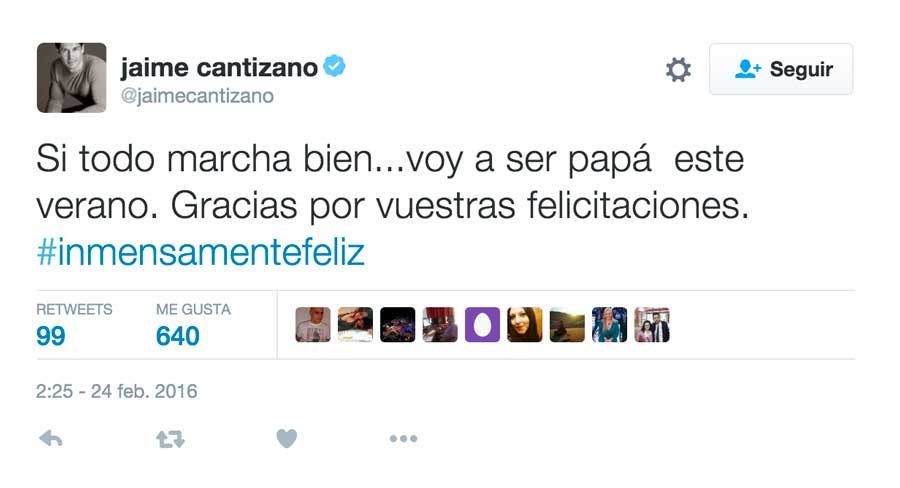 Jaime Cantizano va a ser padre por primera vez a los 42 años. El hijo del presentador nacerá en Estados Unidos a través de gestación subrogada, al igual que ya han hecho otras celebrities como Ricky Martin, Miguel Bosé o Sarah Jessica Parker. El propio Jaime ha mostrado su felicidad a través de un mensaje en Twitter, en el que anunciaba que si todo marcha bien, será papá este mismo verano.