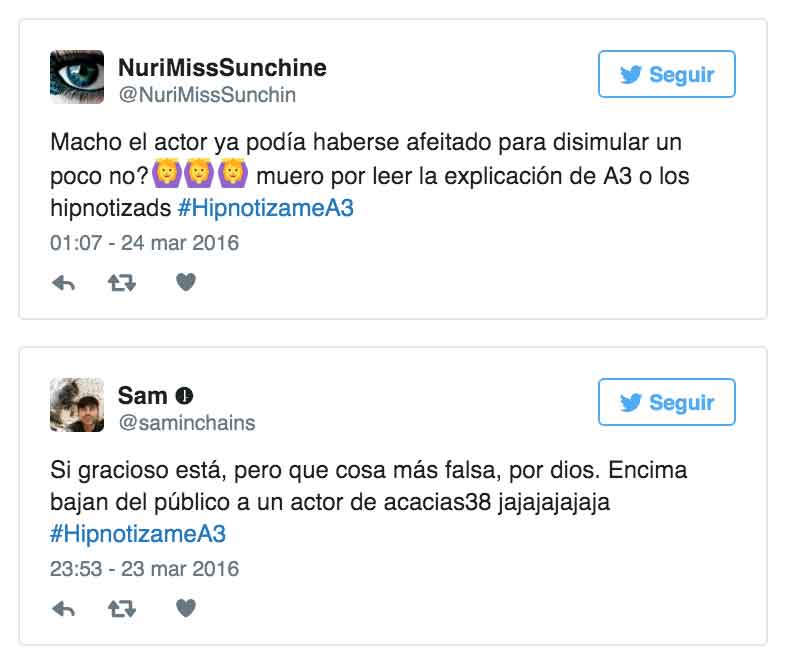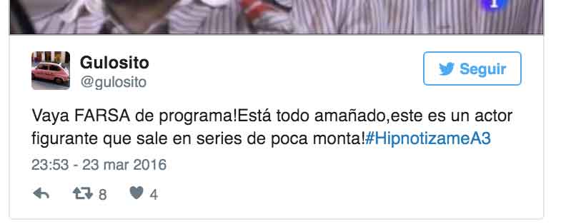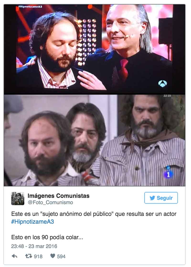 Antena 3 anunciaba a bombo y platillo que su nuevo programa, ‘Hipnotízame’ era 100% real pero los espectadores andan con la mosca detrás de la oreja tras su primera emisión. Esto es lo que descubrieron los ‘tuiteros’, con muy buen ojo, por cierto: